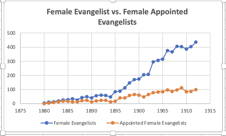 Interestingly, while the number of women licensed as evangelists steadily rose, the number of women appointed to circuits saw only a modest increase. Why? My research suggests this may have been due to societal changes in the Progressive Era, when women became more involved in social causes, including ministry.