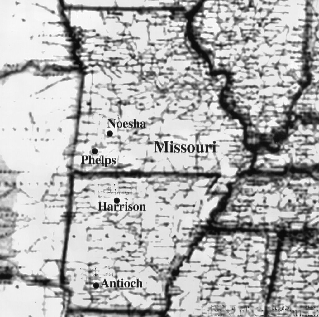 Eliza Witherspoon was a Free Methodist evangelist in the Southern Missouri and Arkansas Conference from the mid-1890s through 1912. The map reflects her official ministry appointments in the conference. Virginia, where her 1896 report originates, is in the mid-left of the state.